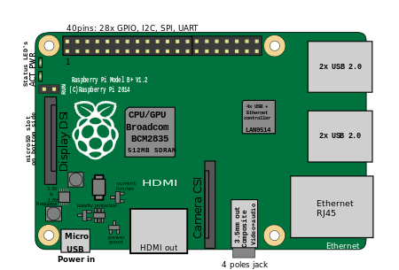 CPU Broadcom BCM2836 900MHz quad-core ARM Cortex-A7 1GB RAM 4 USB ports 40 GPIO pins Full HDMI Ethernet 10/100 Wi-Fi requires USB adapter 802.11n Combined 3.5mm audio/video jack Camera interface (CSI) Display interface (DSI) Micro SD card slot VideoCore IV 3D graphics core Power 4 W (5 V) Size : 85.60 mm × 56.5 mm / 45g Release date February 2015 Price about 40€ |