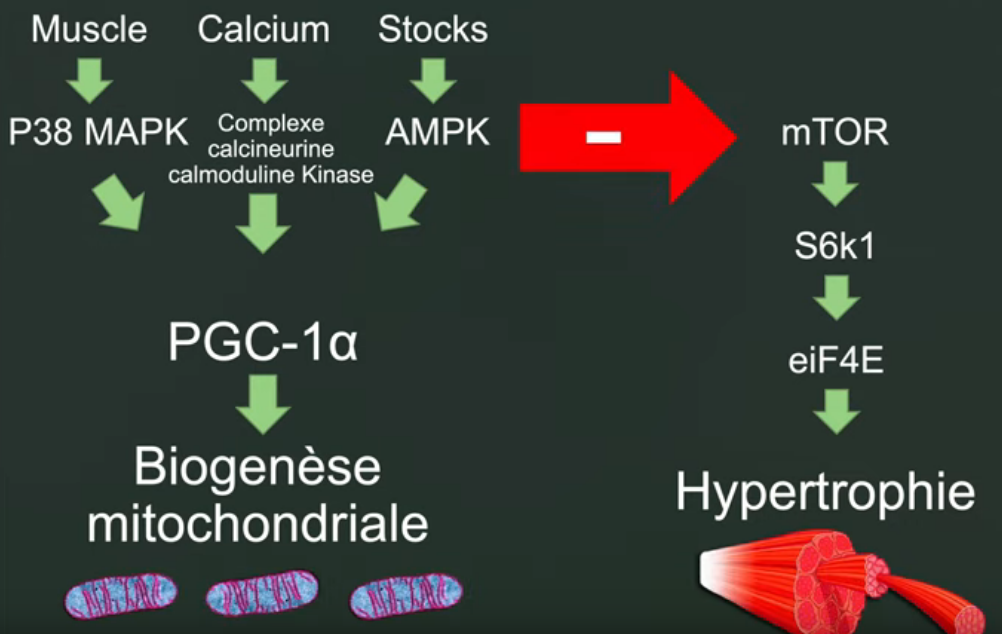 L'endurance a un effet catabolique, notamment à cause des changements hormonaux qui vont nuire à la prise de muscle, mais cela a aussi un autre effet plus direct sur le muscle lui-même : le changements du type de fibres musculaires. Pour être bon en endurance, il faut avoir une bonne dose de fibres de type I, les fibres lentes. Elles sont très vascularisées et utilisent beaucoup l'oxygène pour se contracter. À l'inverse, pour être fort et être capable de se développer rapidement, un muscle a plutôt besoin de fibres de type II, les fibres blanches qui produisent rapidement une grande force, et qui ont un potentiel de développement plus grand. Ce sont ces fibres qui répondent le mieux à l'entraînement avec charges additionnelles. L'être humain part avec un capital de départ pour chaque type de fibres, mais il a aussi des fibres intermédiaires, qui vont être très réceptives à l'entraînement qu'elles subissent et vont commencer à se comporter soit comme des fibres lentes, soit comme des fibres rapides. L'objectif pour devenir rapidement musclé est de diriger l'adaptation des fibres musculaires. Deux efforts antagonistes Conflit entre : la protéine mTOR (l'anabolisme) et la protéine AMPK (métabolisme énergétique)